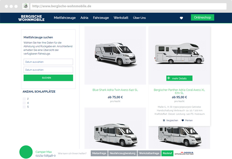 Unser Kunde Bergische Wohnmobile bietet den Kauf, die Reparatur und die Vermietung von Wohnmobilen im Bergischen Land an. Des Weiteren bietet Bergische Wohnmobile einen Onlineshop für Luftzelte und Camping-Zubehör.